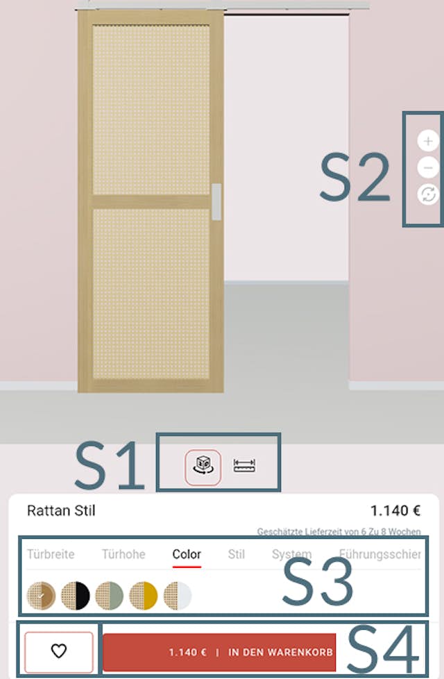 4. Die Elemente, die Sie bearbeiten können, variieren je nach gewähltem Modell (Sektion S3). Bei Rattan-Türen sind dies: