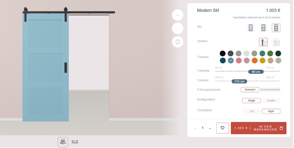 Stellen Sie sich ein Tool vor, das Ihnen hilft, die Produktauswahl zu visualisieren, bevor Sie sie kaufen. So funktioniert unser Konfigurator. Unser Tool ermöglicht: die Auswahl von Größe, Farbe und Anordnung der Tür, die unkomplizierte Auswahl des Schiebesystems, die Möglichkeit, das Projekt in 3D zu betrachten und sogar den Innenraum zu visualisieren. Dank dessen erstellen Sie eine Tür, die perfekt zu Ihren Bedürfnissen passt, in wenigen Sekunden kennen Sie ihren Preis und fügen Sie dem Warenkorb hinzu.