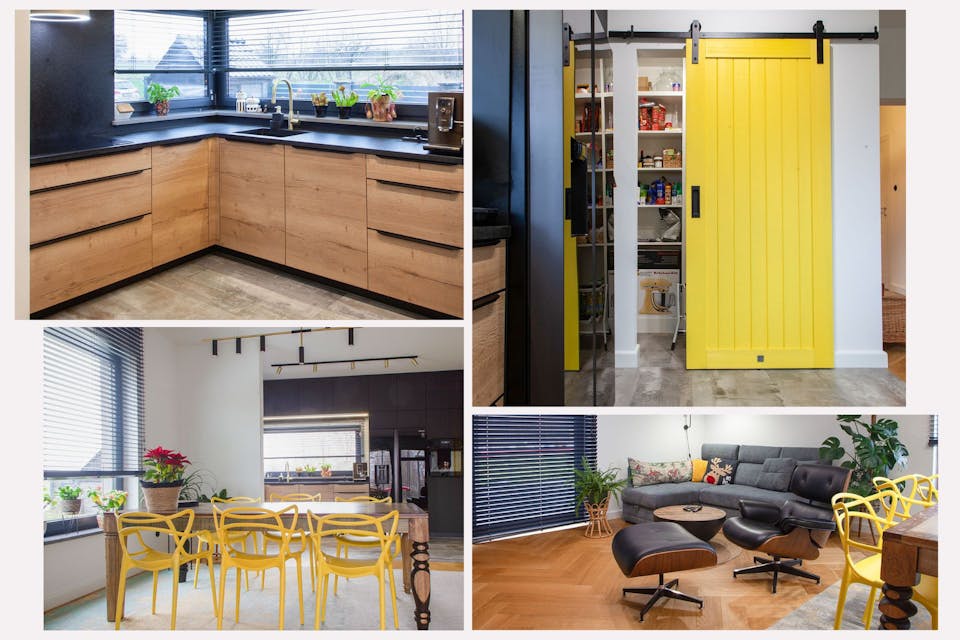 Ein Interieur wie dieses erfreut die Augen und gibt Energie. Es ist modern, aber nicht zu roh, und praktische Aspekte werden hier mit einer tadellosen Verarbeitung kombiniert. Holzelemente (Schrankfronten, Boden) wärmen den industriellen Charakter der Küche auf, der durch schwarze Fliesen an den Wänden oder einen dunkel glänzenden Kühlschrank entsteht. Zudem lässt der tolle pop of colour gelber, lebhafter Schiebetüren keine Langeweile aufkommen.