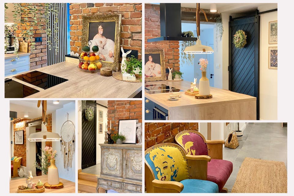 Wenn Sie es mögen, wenn viel los ist, wird Sie dieser kunstvolle, manchmal sogar dekadente Maximalismus zweifellos begeistern. Der Schöpfer dieses Interieurs bewies große Intuition und kombinierte alte Vintage-Elemente mit etwas völlig Neuem und vielleicht sogar innovativem. Schauen Sie sich eine glatte, beige Wand neben einem gealterten Backstein an oder ein fantastisches Porträt von Luiza Mayer von Ferdinand Georg Waldmüller, aber mit ... Kaugummi. In diesem Interieur sehen schwere, solide, schwarze Schiebetüren phänomenal aus.