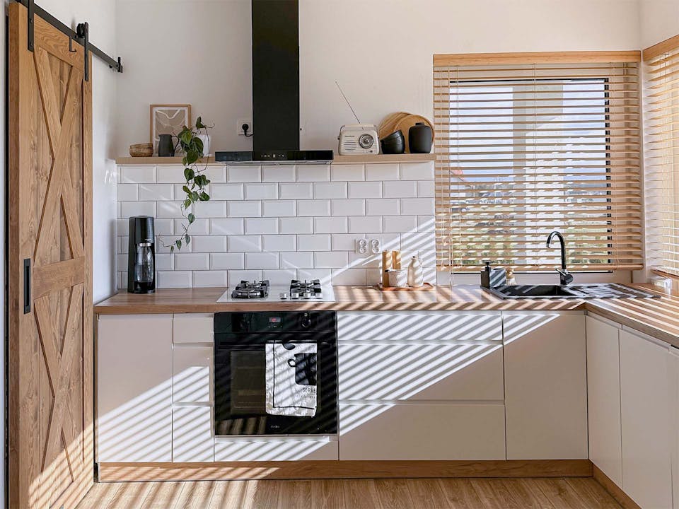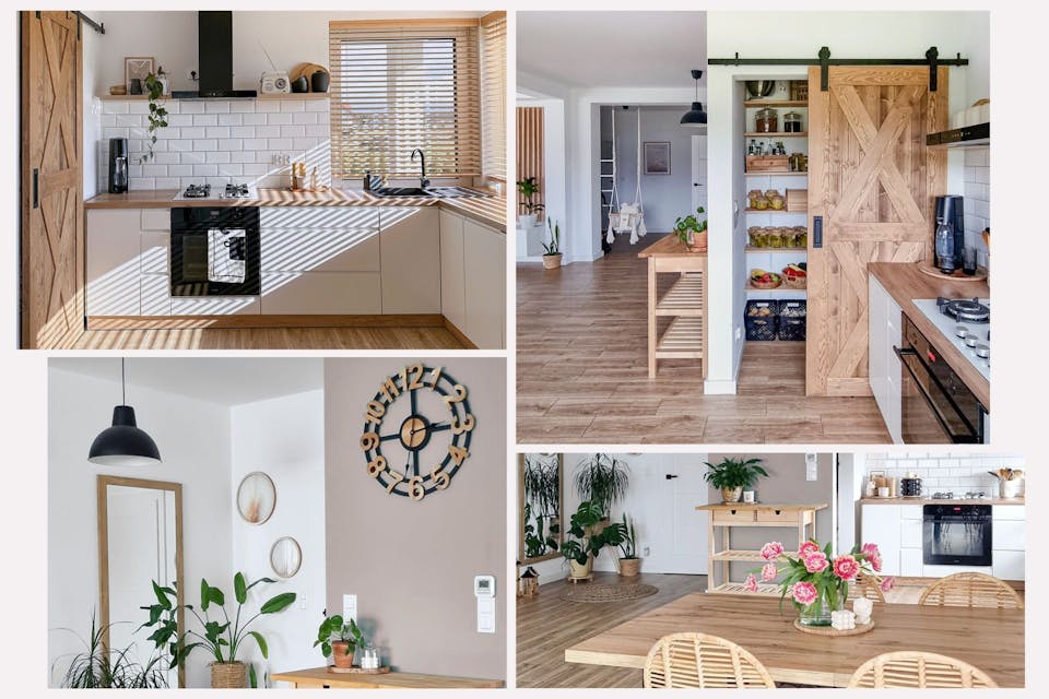 Die erste Inspiration, die wir für Sie vorbereitet haben, ist ein vom skandinavischen Stil inspiriertes Arrangement. Viel Licht und helle, zarte, warme Farben hier. Helle Wände, Holzboden, offene Regale, weiße Schränke. Alles in diesem Interieur fügt sich zu einer harmonischen, ruhigen und geordneten Komposition zusammen. Es lohnt sich, auf die Holzelemente zu achten, die perfekt zur rustikalen Kiefern-Tür passen: eine Uhr mit Holzeinsätzen, eine Lampe und sogar so kleine Elemente wie Löffel oder Schneidebretter, die auf der Theke platziert sind.