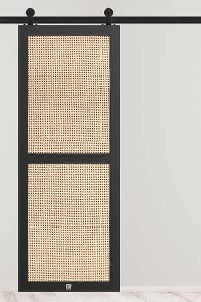 Die wahre Perle dieses Schlafzimmers, die Funktionalität und raffiniertes Design in sich vereint, sind die Schiebetüren zum Ankleidezimmer. In einem minimalistischen Raum hat jedes Element Bedeutung, und diese Türen sind sowohl Blickfang als auch eine praktische Lösung. Die schwarzen, ausdrucksstarken Türrahmen sind mit Paneelen aus Wiener Geflecht gefüllt, das dem Interieur ein Element von Handwerkskunst und Natürlichkeit verleiht und gleichzeitig äußerst modern wirkt. Der Kontrast des massiven, tiefschwarzen Rahmens mit dem zarten, beigefarbenen Geflecht ist beeindruckend und elegant.