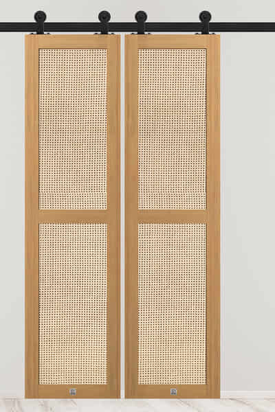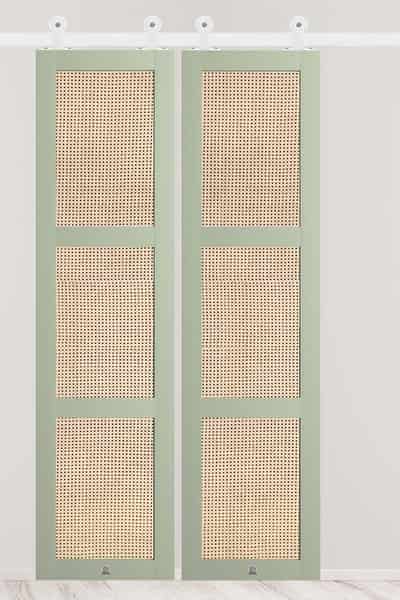 Das Ankleidezimmer befindet sich in einem separaten Raum. Eine doppelte Schiebetür mit salbeifarbenem Rahmen und Rattangeflecht Füllung führt in diesen Raum. Das Massivholz in Kombination mit dem natürlichen Rattan wirkt auffällig und schick. Das weiße Schiebesystem, an dem die Tür befestigt ist, verleiht Leichtigkeit und passt gut zu den weißen Accessoires im Raum.