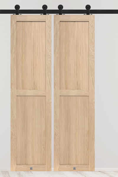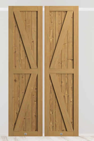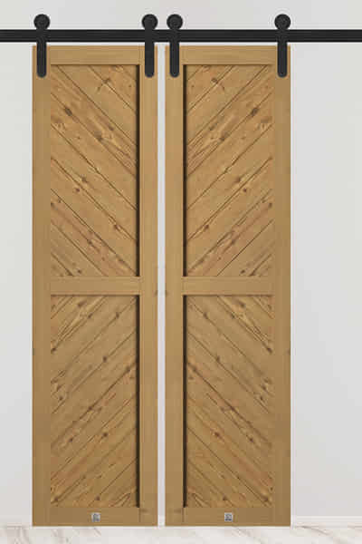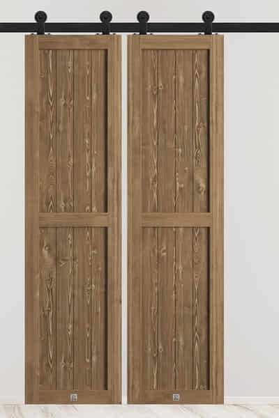 Der Wohnbereich wird vom Flur durch doppelte Schiebetüren getrennt. Holzflügel in einem warmen Holzton, aufgehängt an einer markanten schwarzen Führungsschiene, fügen sich perfekt in das rustikale Ambiente ein. Ihr Charme wird durch die ausgeprägte Holzmaserung betont. Die schwarze Führungsschiene, Rollen und minimalistische schwarze Griffe unterstreichen die natürliche Schönheit des Holzes, verleihen den Türen einen modernen Akzent und schaffen ein ideales Gleichgewicht zwischen Tradition und Moderne.