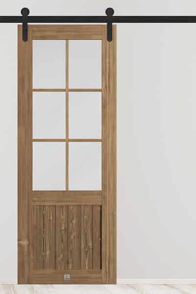 Ein Schlüsselelement der Gestaltung ist das natürliche Eichenholz mit einer ausgeprägten Maserung und warmer Färbung. Es verleiht dem Raum authentische Wärme und Gemütlichkeit. Die Eichen-Schiebetür mit Sprossen und Verglasungen erfüllt nicht nur eine praktische Funktion, indem sie den Windfang vom Rest des Hauses trennt, sondern ist auch eine interessante Dekoration. Die schwarzen, schlichten Beschläge und Griffe verleihen Tiefe und durchbrechen den ländlichen Charakter der Tür.