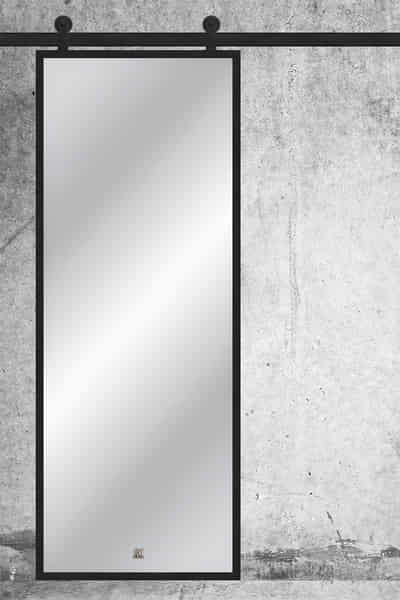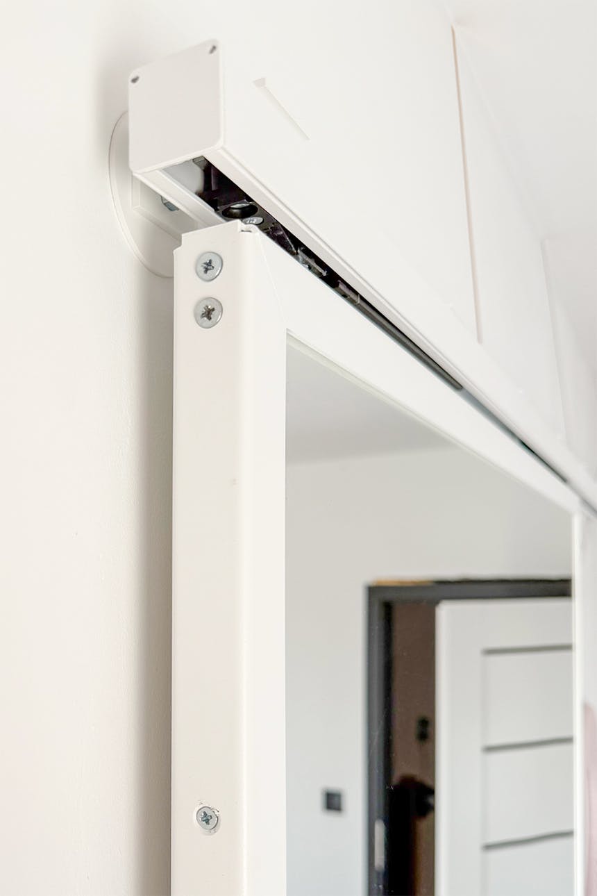 Das wichtigste funktionale Element, das gleichzeitig einen starken visuellen Akzent setzt, ist die Schiebetür zum begehbaren Ankleidezimmer mit Spiegel. Der Spiegel, der sich über die gesamte Höhe und Breite der Tür erstreckt, vergrößert den Raum optisch und reflektiert das natürliche Licht, wodurch das Schlafzimmer heller wirkt. Die Tür dient gleichzeitig als großer Tageslichtspiegel und bietet diskreten Zugang zum begehbaren Kleiderschrank in der Nische. Der weiße, dezente Türrahmen und das minimalistische Schiebesystem harmonieren mit den weißen Wänden, sodass das Gesamtbild stimmig und modern wirkt.