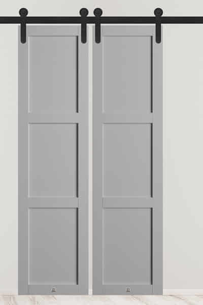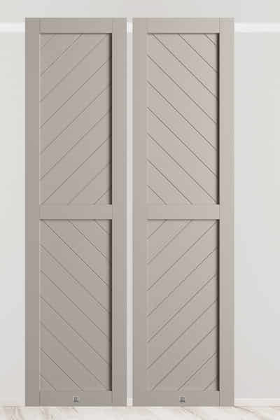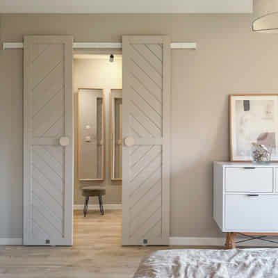 Eine besondere Herausforderung war die Gestaltung des Eingangs zum Schlafzimmer, der sich an der Wand befindet, die im spitzen Winkel an die Wand mit dem Fenster grenzt. Die Wahl fiel auf Schiebetüren, die perfekt in die ungewöhnliche Geometrie des Raums passten. Durch diese Lösung blieb die Tür voll funktionsfähig und das Schlafzimmer konnte geschlossen werden. Darüber hinaus blockieren die Türen, wenn sie vollständig geöffnet sind, nicht das Tageslicht, das durch die Fenster fällt. Die zweiflügelige Tür nutzt den begrenzten Platz optimal aus. Ihre graue Farbe harmoniert mit dem Farbschema des Interieurs und betont seinen modernen Charakter.