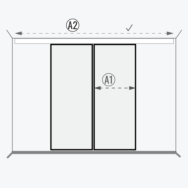 Die Länge der Führungsschiene richtet sich nach der Breite der Türblätter. Die Standardlänge der Führungsschiene ist so gewählt, dass die vollständige Öffnung der Tür und die korrekte Montage der Seitenstopper gewährleistet sind. Wenn Sie eine nicht standardmäßige Größe benötigen kontaktieren Sie uns.