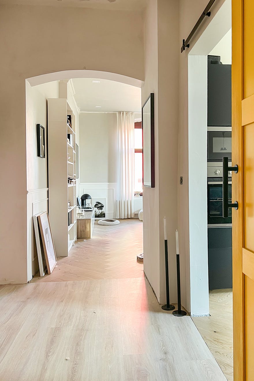 Eine über ein Jahrhundert alte Wohnung in einem alten Stadthaus an der Nordsee wurde einer gründlichen Renovierung unterzogen. Jetzt sind die Eigentümer in der Phase der Fertigstellung und Dekoration, und das Interieur erhält einen völlig neuen Charakter. Das vom skandinavischen Design inspirierte Interieur besticht durch seine Ruhe und Neutralität. Helle Räume, schlichte Linien und minimalistische Ästhetik und gleichzeitig eine wohnliche, gemütliche Atmosphäre. Neutrale Farben aus Beige, Schwarz und Weiß bestimmen dieses Interieur, aber es fehlt nicht an farbigen Akzenten.