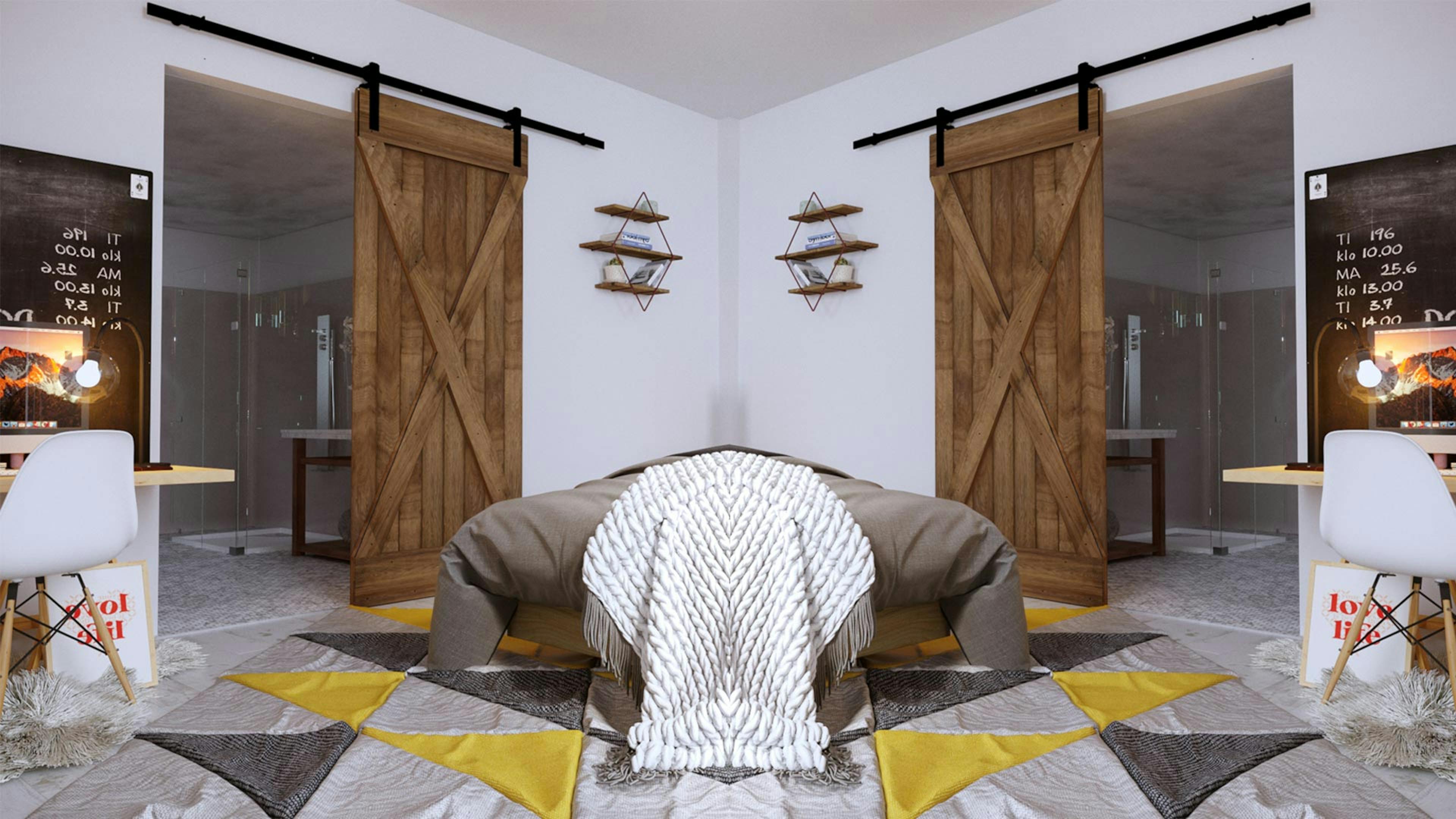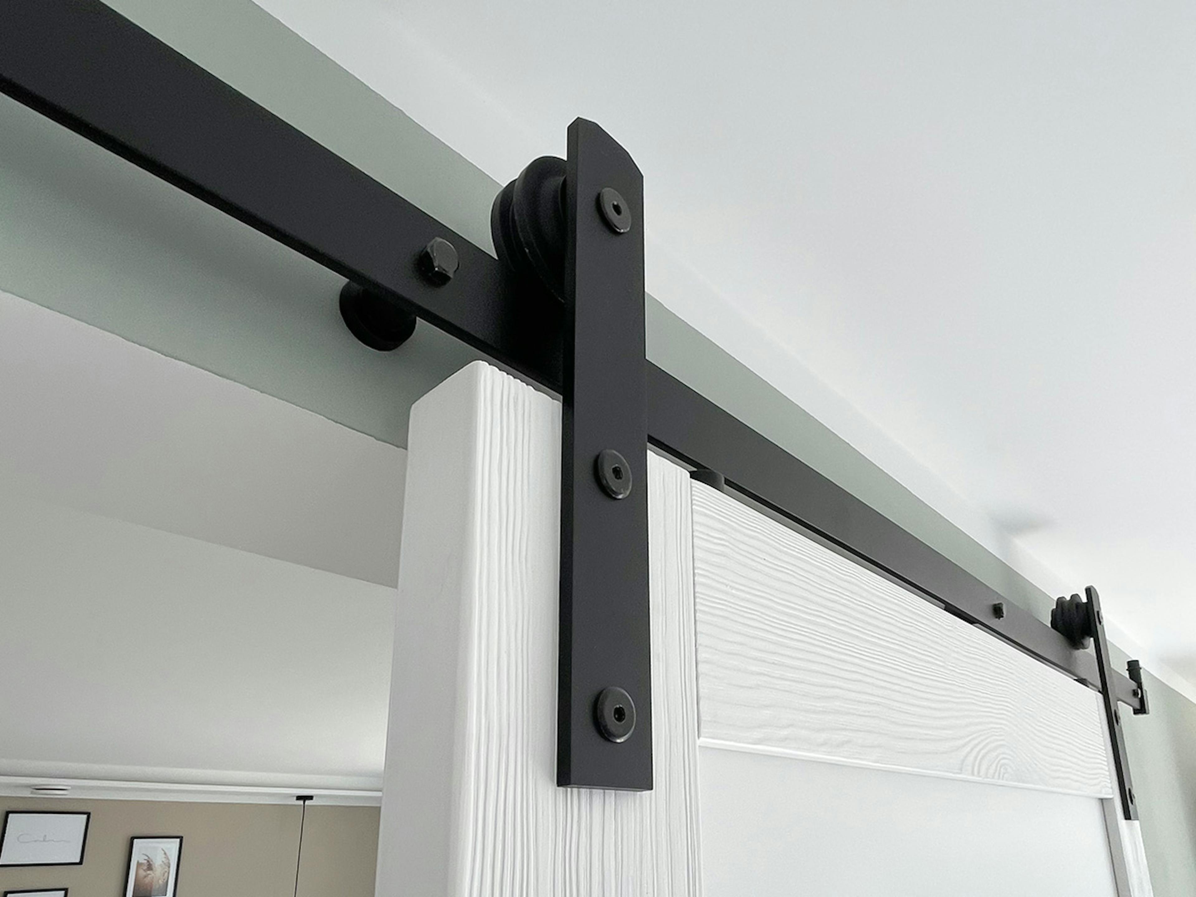 Beim Minimalist-System befindet sich das Schiebesystem hinter der Tür, sodass kein Platz für Rollen gelassen werden muss, 2 cm Platz über der Tür reichen für ihre korrekte Installation aus.