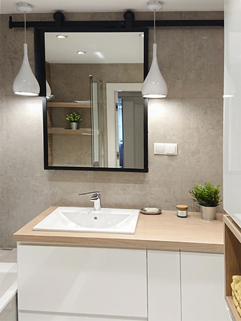 Das Badezimmer ist ein weiterer Ort, an dem Sie sich mit Spiegeln umgeben sollten. Wenn unser Badezimmer klein ist und Sie von einem Spiegel träumen, in dem Sie die gesamte Silhouette sehen können, kann sich die Schiebetür mit Spiegel als hervorragende Lösung für dieses Problem erweisen.