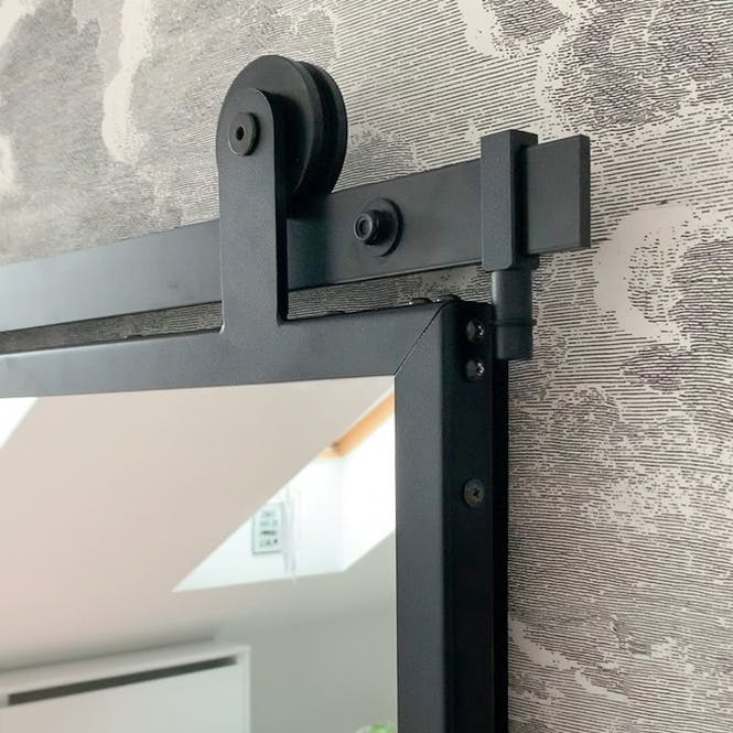 Maßgefertigt, eine große, verschiebbare Spiegelscheibe in einem filigranen Metallrahmen der Tür Lara mit einer eleganten, dezenten Loft-Führung, fügt sich wunderbar in die begrenzte, minimalistische Farbpalette ein, die das Interieur dominiert, und erfüllt alle Erwartungen und Anforderungen von sein Mieter.