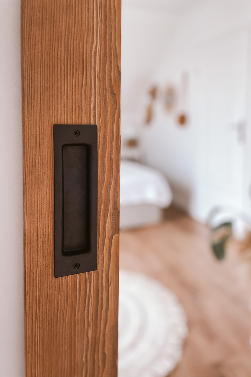 Neben dem Schlafzimmer befindet sich ein kleines Ankleidezimmer, das durch eine Schiebetür mit einem großen Spiegel in einem Holzrahmen zugänglich ist. Der Rahmen in natürlicher Holzfarbe fügt sich perfekt in die Einrichtung des Schlafzimmers ein und dient als Dekoration. Die verspiegelte Oberfläche reflektiert zusätzlich Licht und lässt das Schlafzimmer geräumiger erscheinen. Das schwarze Schiebesystem sorgt für ein leichtes Öffnen und Schließen der Türen und bietet einfachen Zugang zu den weißen Schränken und Regalen, in denen die Garderobe des Besitzers verborgen ist. Diese Lösung vereint Funktionalität und Ästhetik. Sie ist praktisch und schön zugleich.