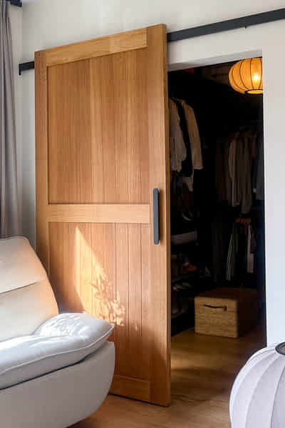 Was dieses Schlafzimmer so besonders durchdacht macht, ist die stilvolle Abtrennung des begehbaren Kleiderschrankes. Anstelle von Standard-Türflügeln wurden hier Eichen-Schiebetüren verwendet. Diese Lösung nimmt keinen wertvollen Platz weg und ermöglicht es, einen bequemen Sessel daneben zu platzieren, ohne Kollisionen beim Öffnen befürchten zu müssen. Das Türblatt aus natürlichem Eichenholz besticht durch seine klare Maserung und einen warmen Farbton. Die solide Konstruktion mit sichtbarem Rahmen harmoniert ideal mit den Möbeln sowie dem Boden und bildet ein stimmiges, ästhetisches Ganzes. Moderne Akzente setzen flache, mattschwarze Griffe – ein subtiles Detail, das Charakter verleiht.