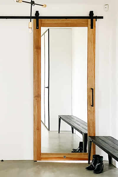 Um die Klarheit der Form zu bewahren, wurde ein minimalistisches Schiebesystem gewählt. Das Fehlen von sichtbaren, massiven Rollen oder Beschlägen lässt die Konstruktion leicht und modern wirken. Nur eine schlanke schwarze Führungsschiene ist sichtbar, die elegant mit der hellen Wand kontrastiert. So gestaltete Türen sind ein idealer Raumteiler für den Stauraumbereich, die für Ordnung sorgen, ohne die Ruhe und Harmonie des Schlafzimmers zu stören.