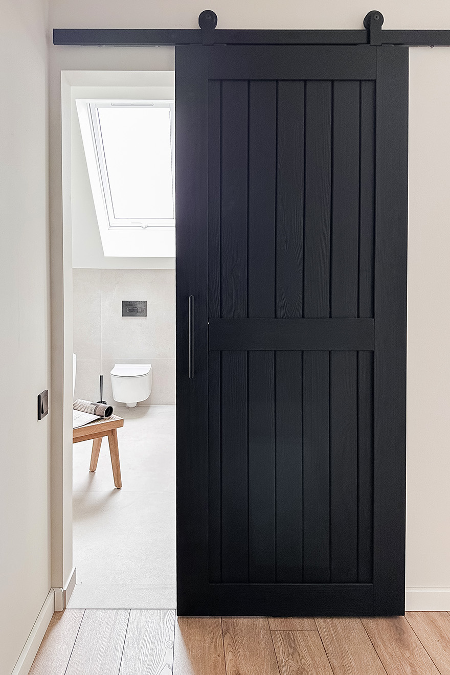 Dieses Badezimmer befindet sich im Hauptschlafzimmer und ist über Schiebetüren aus massivem Holz zugänglich. Naturholz mit sichtbarer Struktur und tiefem Mattschwarz ergänzen die Raumgestaltung perfekt. Darüber hinaus sorgt das Smart-System für leichte und leise Bewegungen.