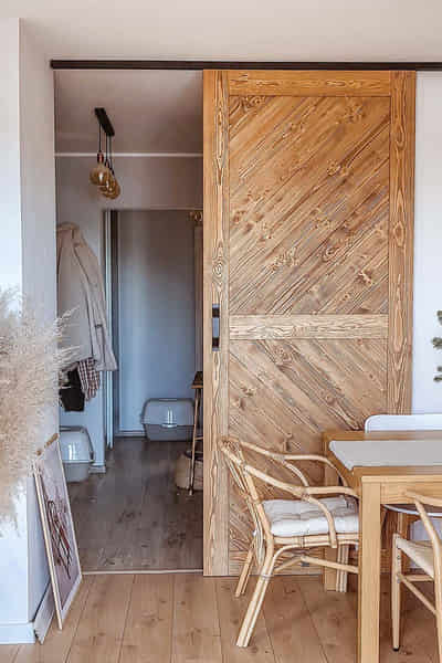 Diese Wohnung kann sowohl ein offener Raum als auch ein privater, getrennter Raum sein. Wie der Besitzer selbst sagt, wird eine Schiebetür eingesetzt, um etwas Privatsphäre zu bieten, wenn Freunde zu seinen Töchtern kommen. In einer solchen Situation können Eltern in einem großen Raum bleiben und niemanden stören. Große Schiebetür von ungewöhnlicher Größe wurden an Deckenaufhängungen montiert, dies löste das Problem der Unfähigkeit, sie an der Wand zu montieren. Das Modell Loft wurde ebenfalls mit Metallelementen verstärkt.