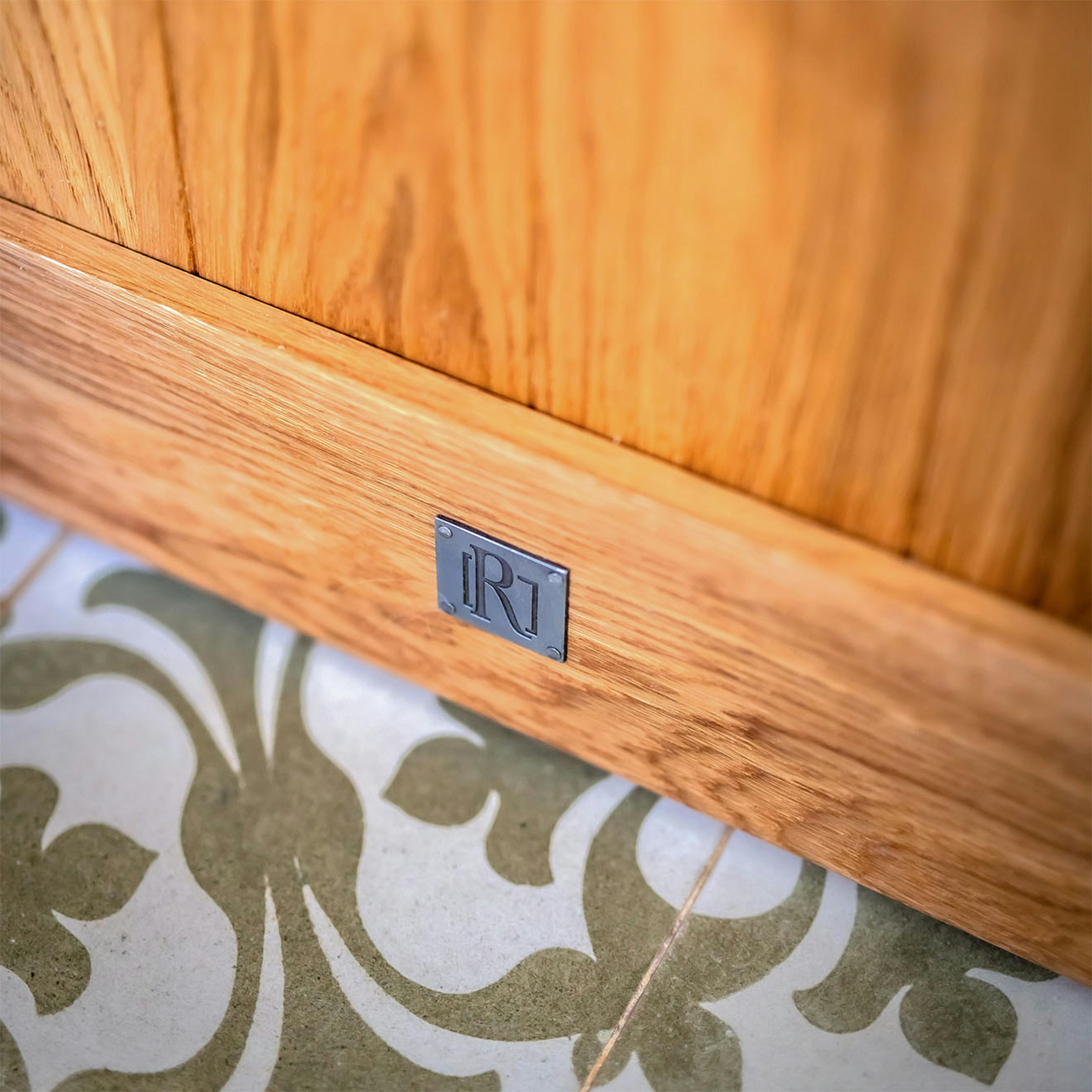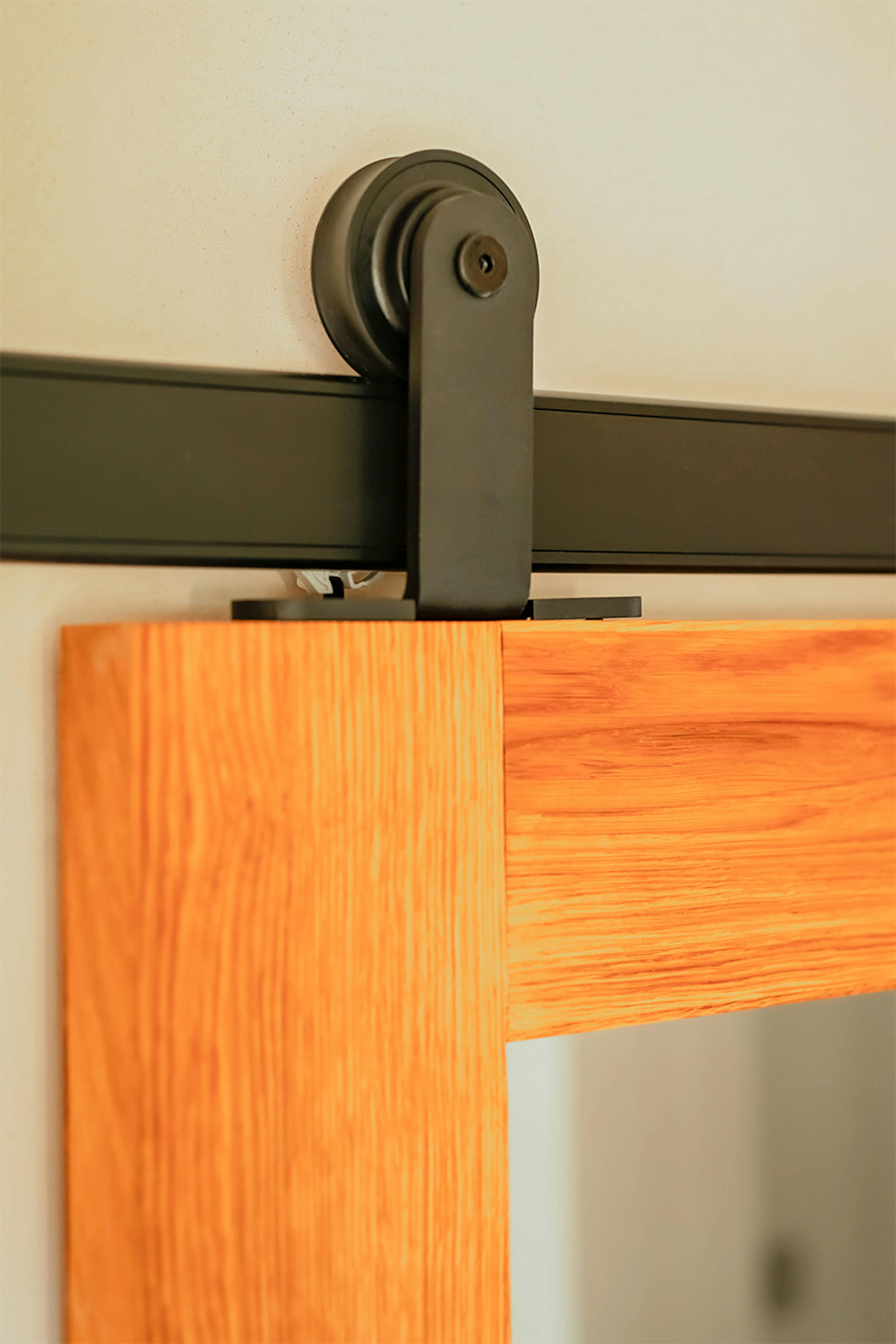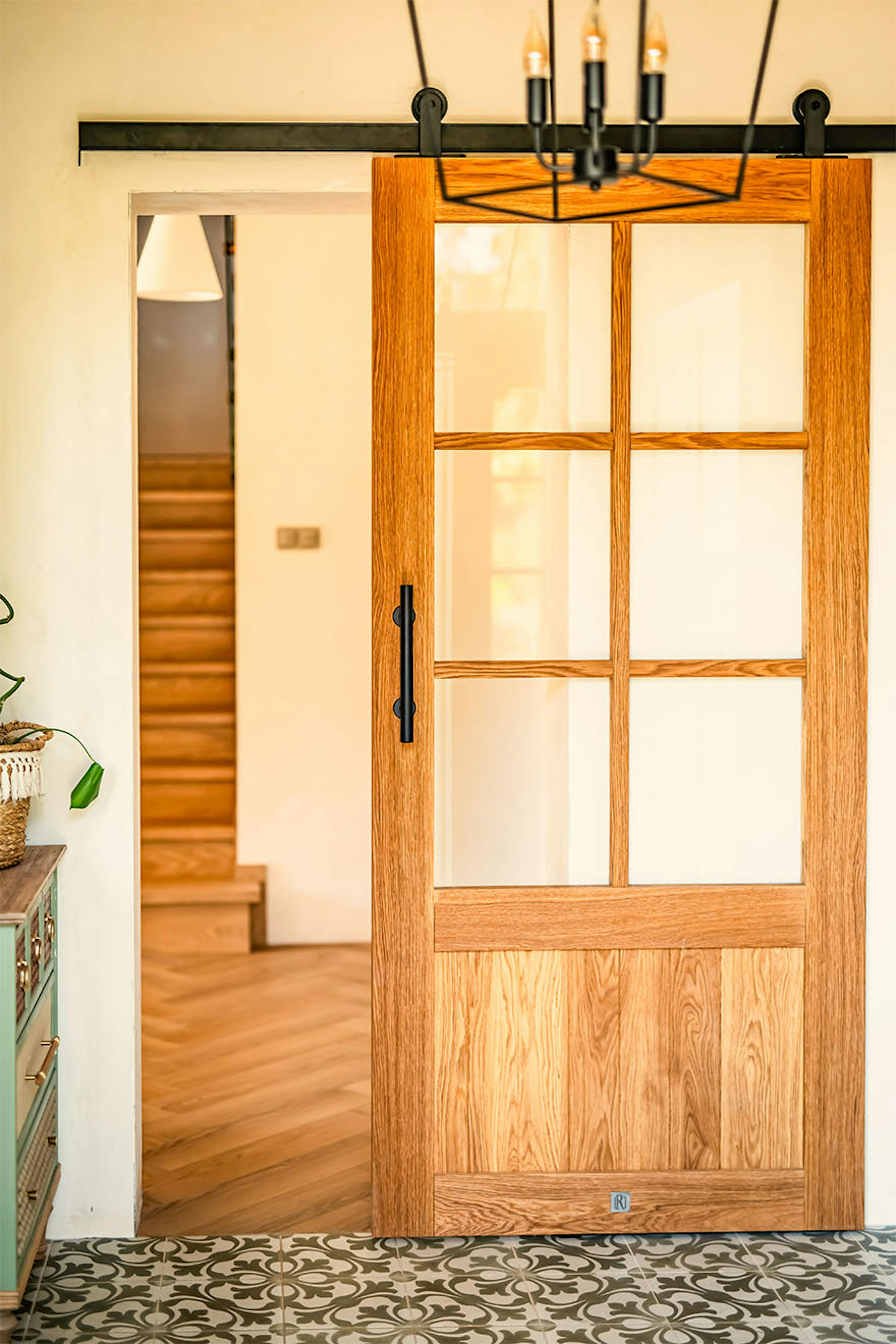 Ein Schlüsselelement der Gestaltung ist das natürliche Eichenholz mit einer ausgeprägten Maserung und warmer Färbung. Es verleiht dem Raum authentische Wärme und Gemütlichkeit. Die Eichen-Schiebetür mit Sprossen und Verglasungen erfüllt nicht nur eine praktische Funktion, indem sie den Windfang vom Rest des Hauses trennt, sondern ist auch eine interessante Dekoration. Die schwarzen, schlichten Beschläge und Griffe verleihen Tiefe und durchbrechen den ländlichen Charakter der Tür.