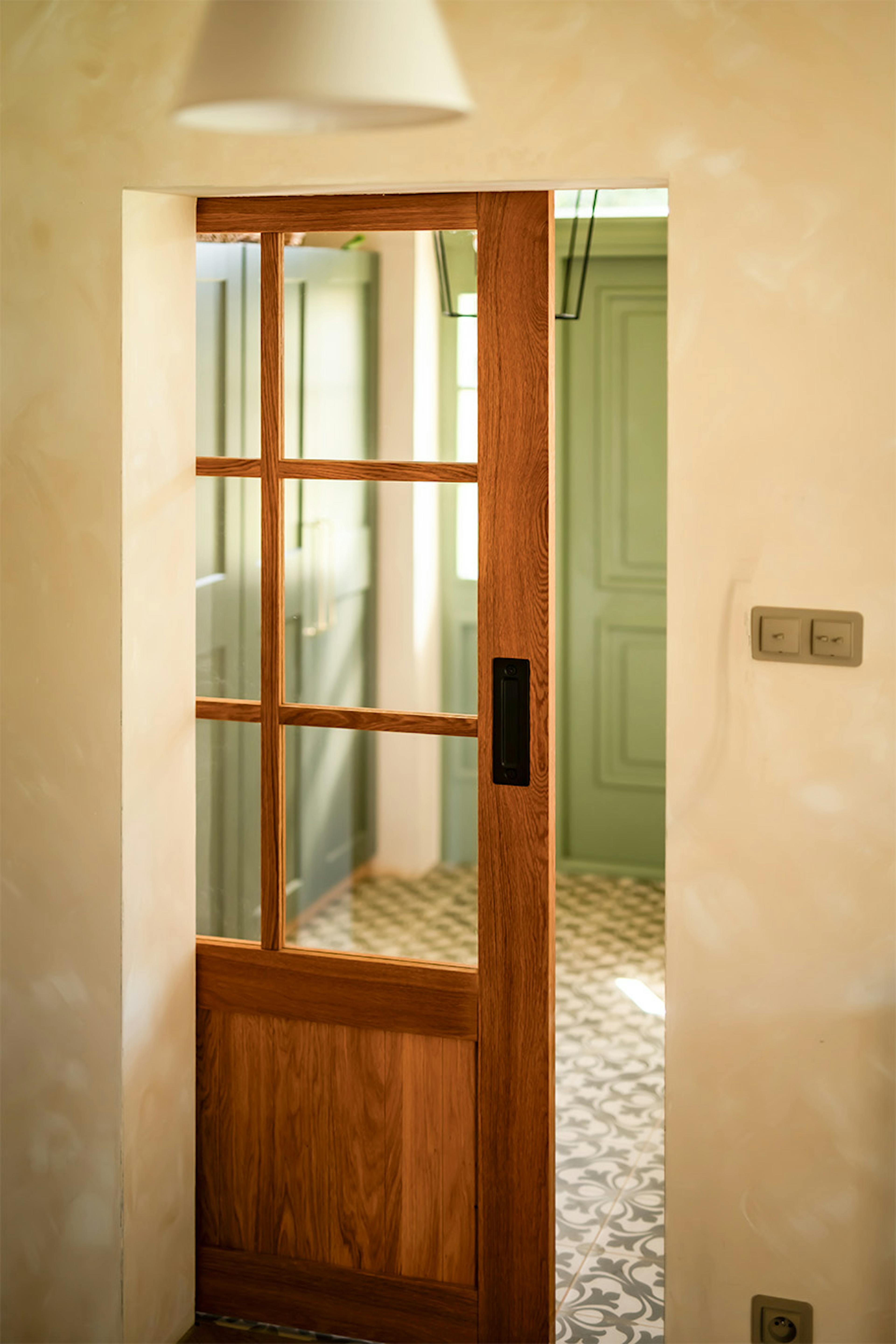 Im Innenraum dominiert ein harmonisches Farbdreieck, in dem Grüntöne die Hauptrolle spielen. Die subtilen grünen Farbschattierungen, die für den Einbauschrank, die Eingangstür und die lackierten Fronten der Kommode verwendet wurden, vermitteln Ruhe, Verbundenheit mit der Natur und ein Gefühl von Leichtigkeit. Die Wände sind in einem warmen Weiß- oder Cremeton gehalten, der einen neutralen Hintergrund für das lebendige Grün und das natürliche Holz bildet.