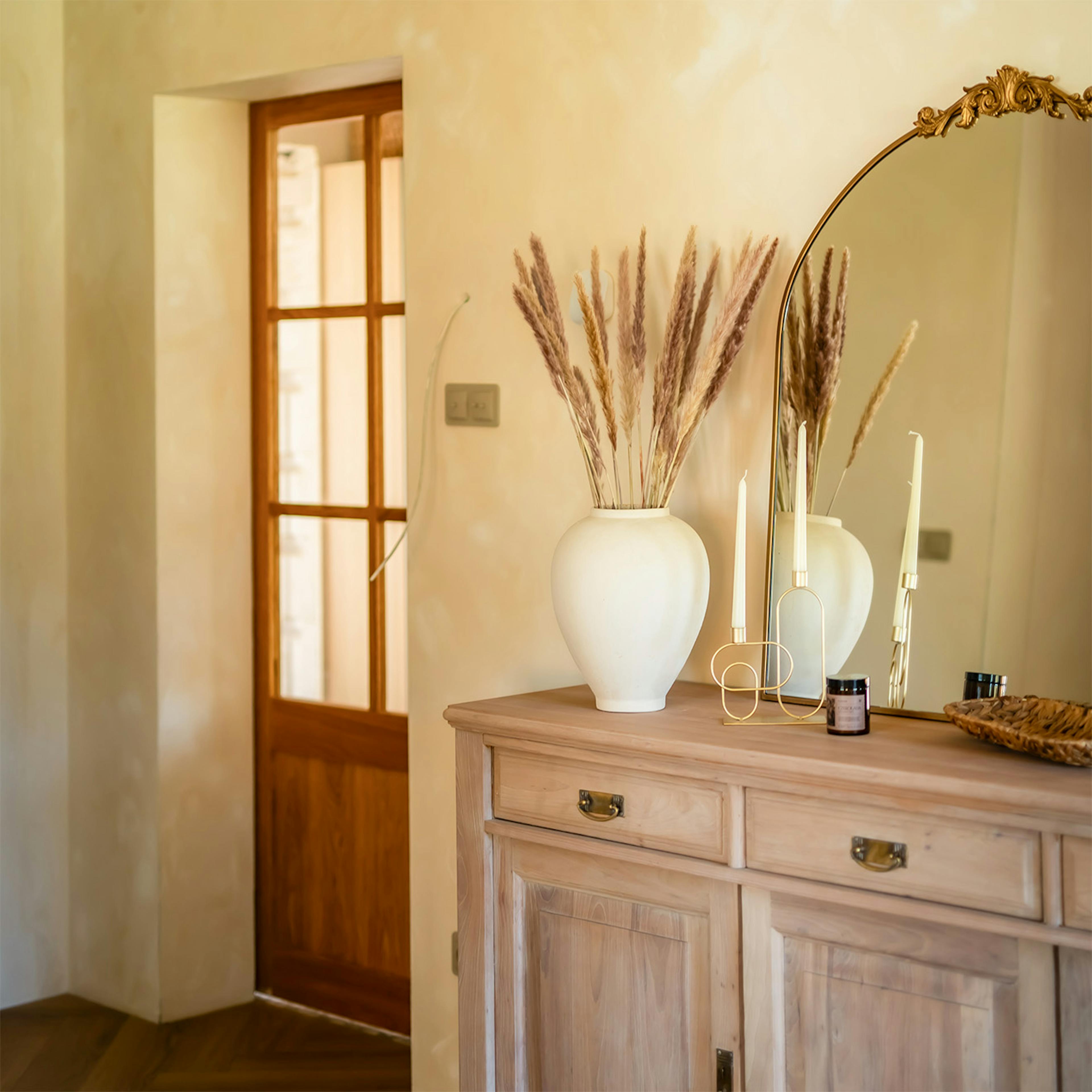 Die Gemütlichkeit wird durch natürliche Akzente wie Körbe und Übertöpfe aus Seegras oder Weide unterstrichen, die dem Innenraum Textur und Tiefe verleihen. Lebende Pflanzen und getrocknete Gräser wecken Assoziationen mit der Natur und machen den Raum äußerst freundlich und harmonisch.
