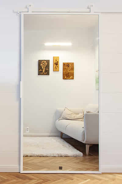 Die Wohnung ist eine Kombination aus zwei Stilen, Neorustic mit einem Hauch von Englisch. In dieser Wohnung wird Modernität perfekt mit stilisierten Möbeln kombiniert. Unsere Türen befinden sich vor dem Eingang und bilden einen Schiebespiegel. Durch Platzieren der Tür mit einem Spiegel wird der Korridor optisch vergrößert. Es gibt auch einen Spiegel an der Wand daneben. Dadurch entsteht eine Spiegelwand mit einem Schiebespiegel. Ein Kleiderschrank ist hinter der Tür versteckt. Die ganze Wohnung hat schwarz lackiertes Metall, bestehend aus Küchenlampen, Tischen, Plakatrahmen und unserem Führer. Die Erhaltung der Konsistenz und Wiederholbarkeit der verwendeten Materialien bedeutet, dass wir uns wie zu Hause fühlen.