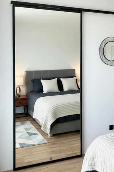 Das wichtigste funktionale Element, das gleichzeitig einen starken visuellen Akzent setzt, ist die Schiebetür zum begehbaren Ankleidezimmer mit Spiegel. Der Spiegel, der sich über die gesamte Höhe und Breite der Tür erstreckt, vergrößert den Raum optisch und reflektiert das natürliche Licht, wodurch das Schlafzimmer heller wirkt. Die Tür dient gleichzeitig als großer Tageslichtspiegel und bietet diskreten Zugang zum begehbaren Kleiderschrank in der Nische. Der weiße, dezente Türrahmen und das minimalistische Schiebesystem harmonieren mit den weißen Wänden, sodass das Gesamtbild stimmig und modern wirkt.