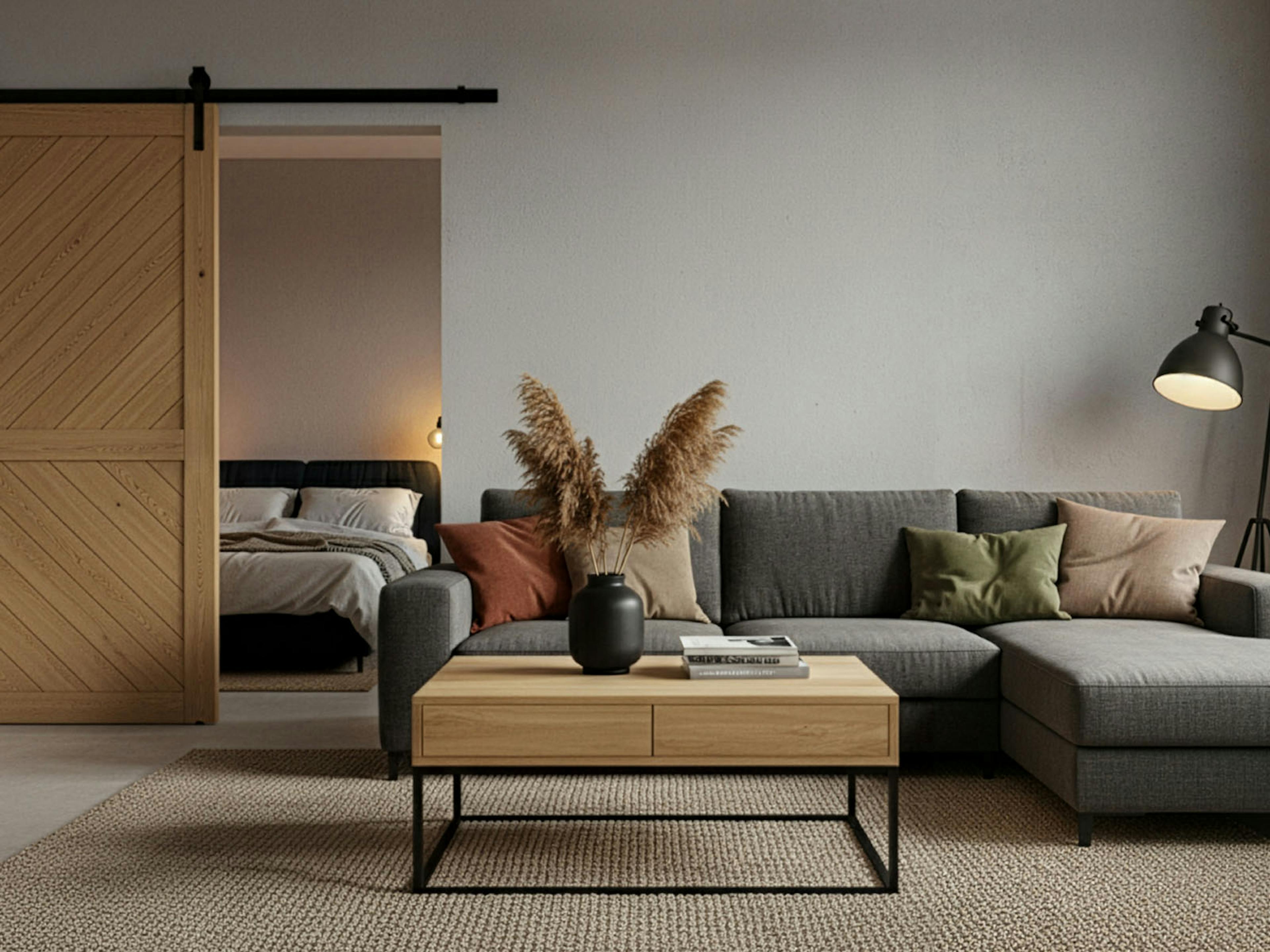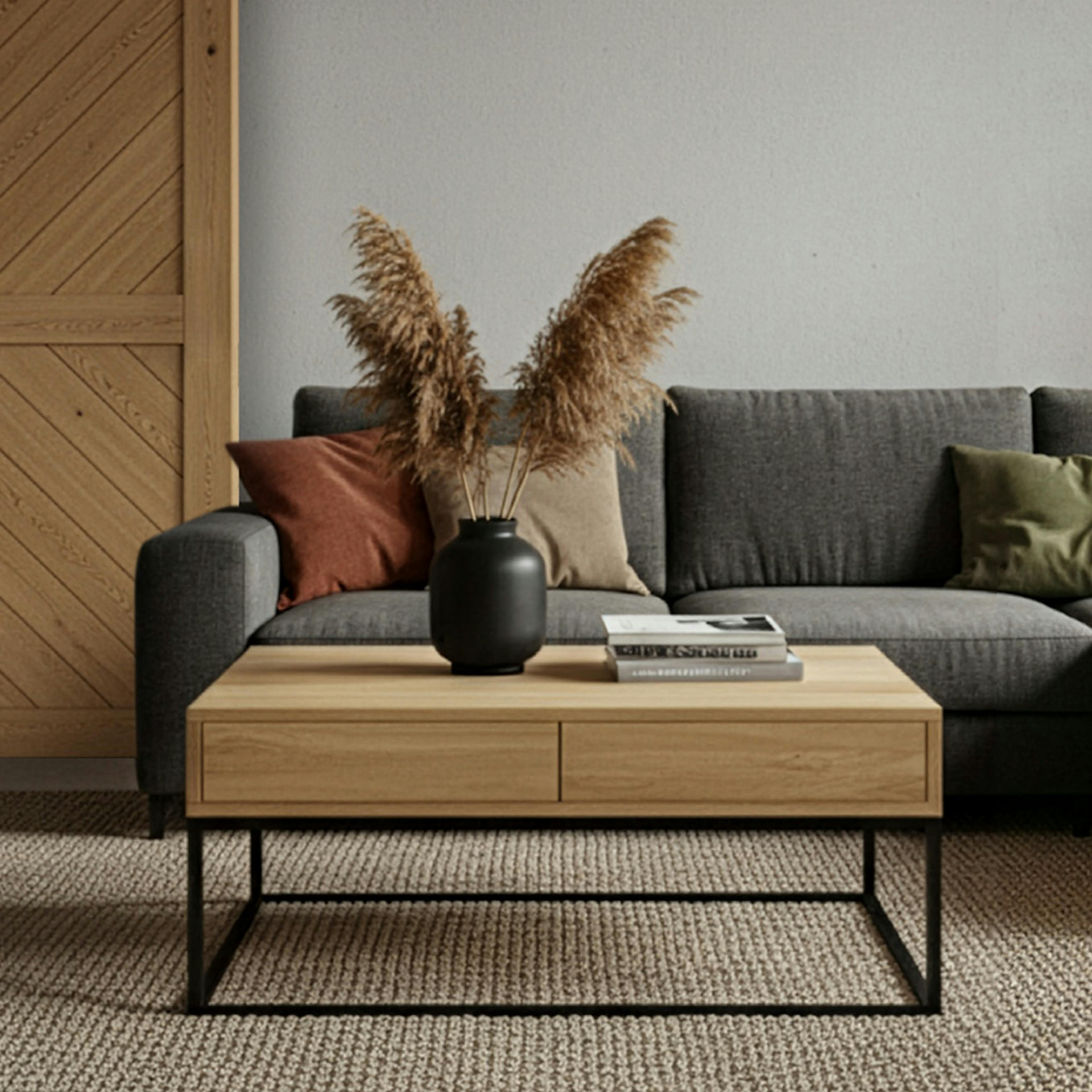 Der Couchtisch im Modo-Stil ist ein vollendetes Beispiel für moderne Handwerkskunst, bei dem die Strenge der industriellen Form harmonisch mit der Wärme der Natur harmoniert. Der einzigartige Charakter des Möbels wird durch die sanft gebürstete Tischplatte aus massiver Eiche definiert, die die natürliche Holztextur und die einzigartige Maserung zur Geltung bringt.