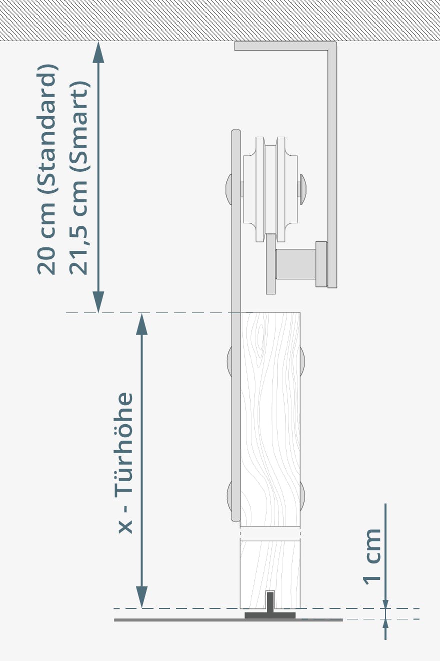 Um die Höhe der Tür (X), die auf Deckenhalterungen montiert werden kann, zu bestimmen, messen Sie zuerst sorgfältig den Abstand zwischen Decke und Boden. Ziehen Sie dann 21 cm für Standard-System oder 22,5 cm für Smart-System von diesem Abstand ab, um die maximale Türhöhe zu erhalten (unter der Annahme, dass der Abstand zwischen Decke und Boden über die gesamte Länge der Wand gleich ist).