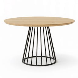 Die massive Tischplatte aus natürlichem Eichenholz ist mit Rubio Monocoat®-Ölen behandelt, was nicht nur eine außergewöhnliche Haltbarkeit und den Erhalt der natürlichen Textur gewährleistet, sondern vor allem einen sicheren Kontakt mit Lebensmitteln garantiert. Die Holzplatte ruht auf einem geometrischen Stahlgestell, dessen zarte, konische Form der gesamten Konstruktion Leichtigkeit und Finesse verleiht.