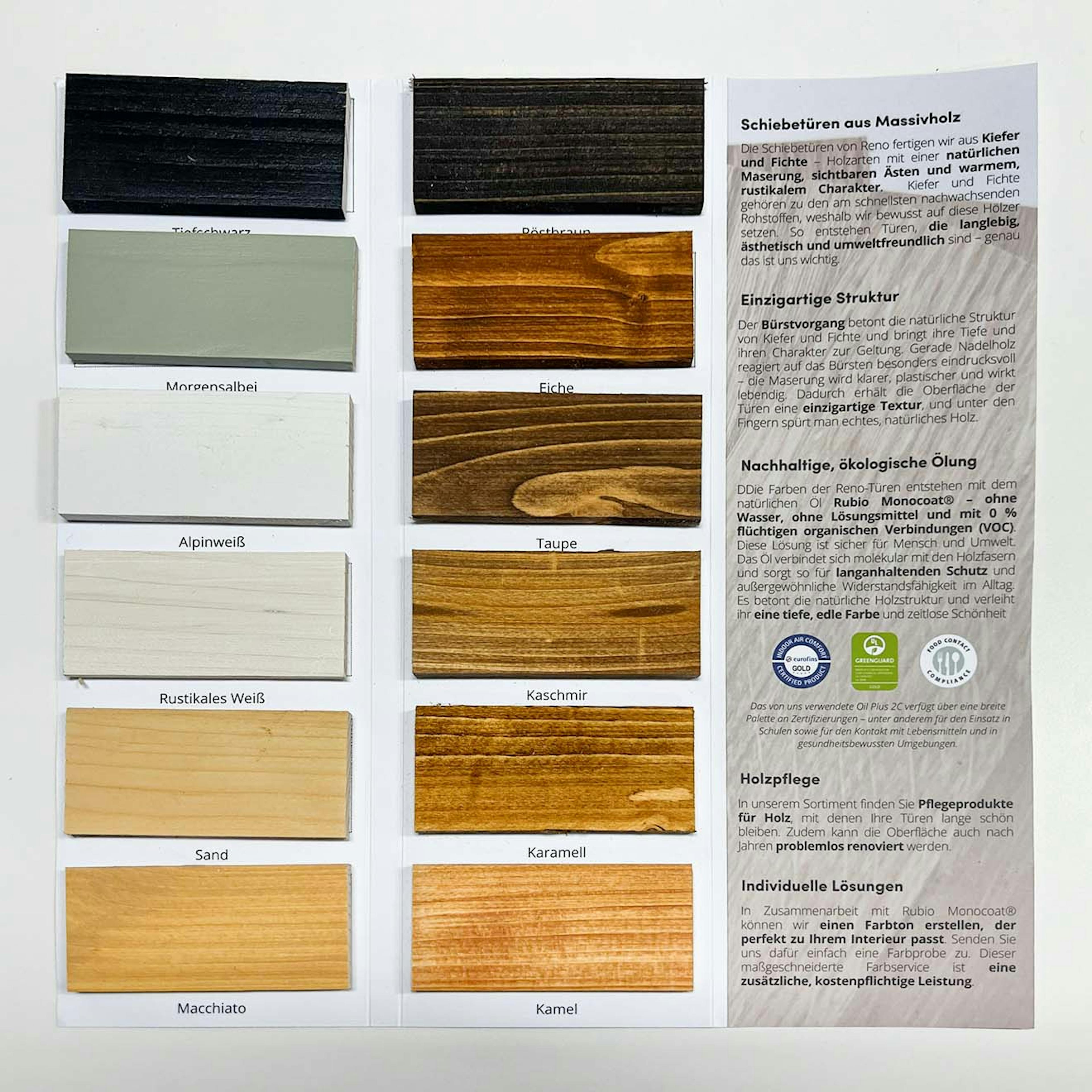 In der Farbfächer präsentieren wir alle unsere verfügbaren Farbtöne. Sollten Sie nach der Ansicht der Palette im Licht Ihrer Räumlichkeiten zwischen mehreren Nuancen schwanken, empfehlen wir Ihnen, größere Holzmuster zu bestellen. Diese Muster ermöglichen eine bessere Beurteilung nicht nur der Farbe selbst, sondern auch der einzigartigen Struktur und Maserung der Kiefer, was vor der endgültigen Entscheidung von entscheidender Bedeutung ist.