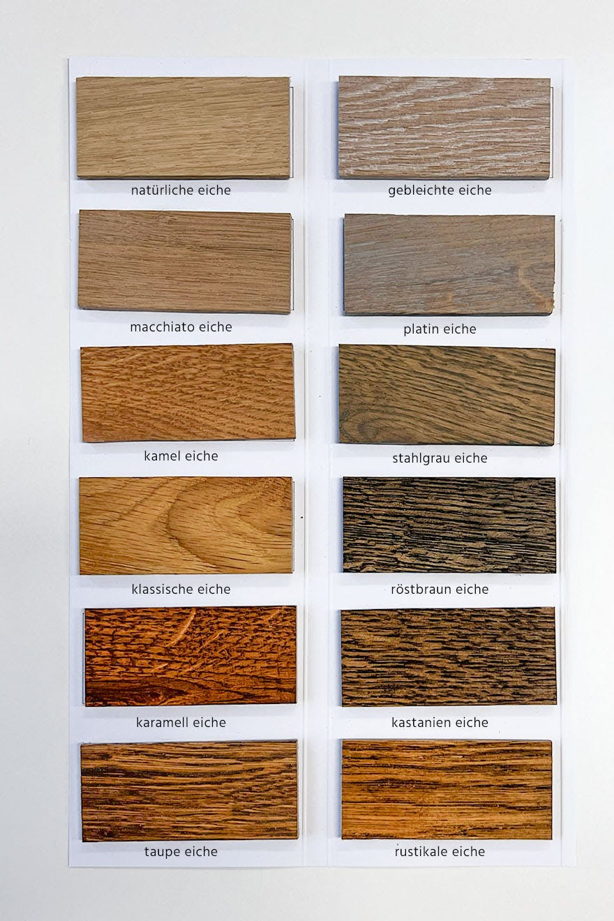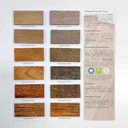 In der Farbfächer präsentieren wir alle unsere verfügbaren Farbtöne. Sollten Sie nach der Ansicht der Palette im Licht Ihrer Räumlichkeiten zwischen mehreren Nuancen schwanken, empfehlen wir Ihnen, größere Holzmuster zu bestellen. Diese Muster ermöglichen eine bessere Beurteilung nicht nur der Farbe selbst, sondern auch der einzigartigen Struktur und Maserung der Eiche, was vor der endgültigen Entscheidung von entscheidender Bedeutung ist.