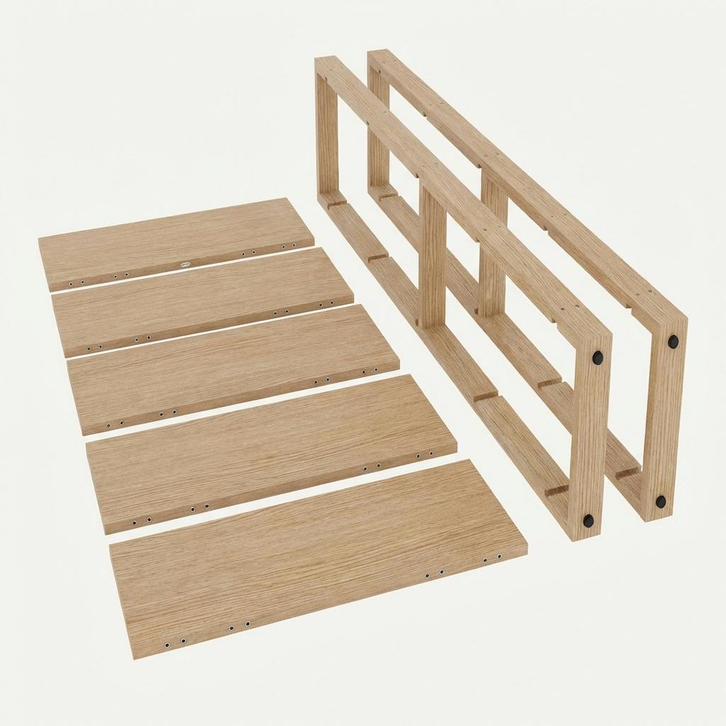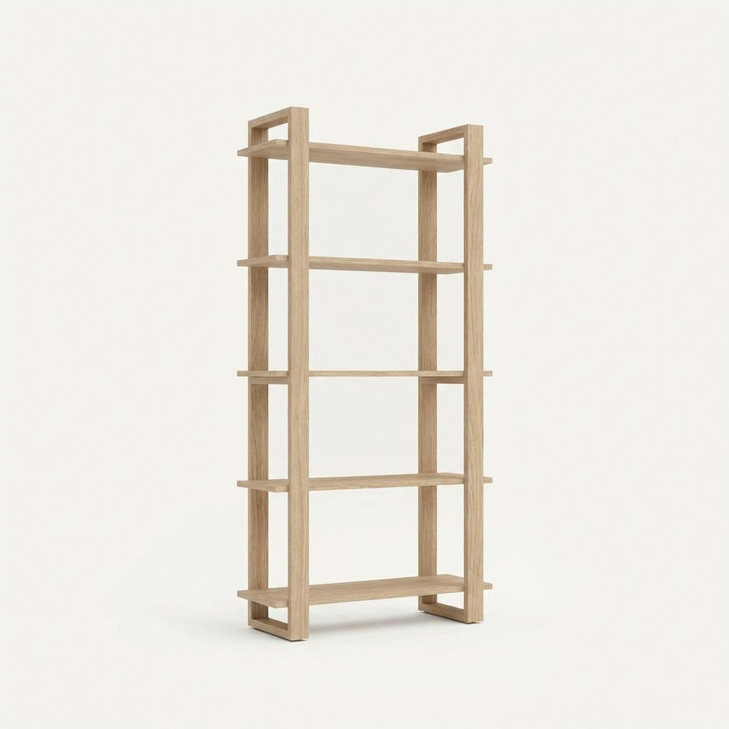 Dieses Modell zeichnet sich durch seine einzigartige Leiterkonstruktion aus. Solide Regalböden aus Massivholz, die in zwei Eichenrahmen eingefasst sind, verleihen ihm einen architektonischen Charakter und sorgen für volle Stabilität. Das Regal ist vollständig aus massiver Eiche gefertigt, was es extrem langlebig und widerstandsfähig macht. Die natürliche Maserung und die tiefe Farbe des Holzes machen jedes Exemplar zu einem Unikat und verleihen dem Innenraum eine edle Note.