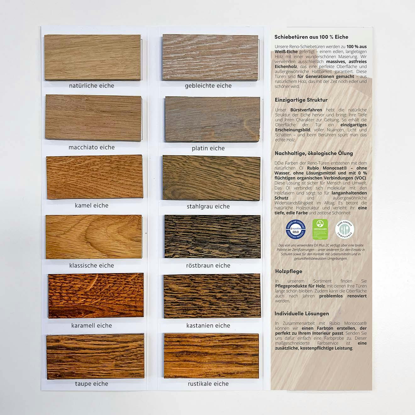 In der Farbfächer präsentieren wir alle unsere verfügbaren Farbtöne. Sollten Sie nach der Ansicht der Palette im Licht Ihrer Räumlichkeiten zwischen mehreren Nuancen schwanken, empfehlen wir Ihnen, größere Holzmuster zu bestellen. Diese Muster ermöglichen eine bessere Beurteilung nicht nur der Farbe selbst, sondern auch der einzigartigen Struktur und Maserung der Eiche, was vor der endgültigen Entscheidung von entscheidender Bedeutung ist.